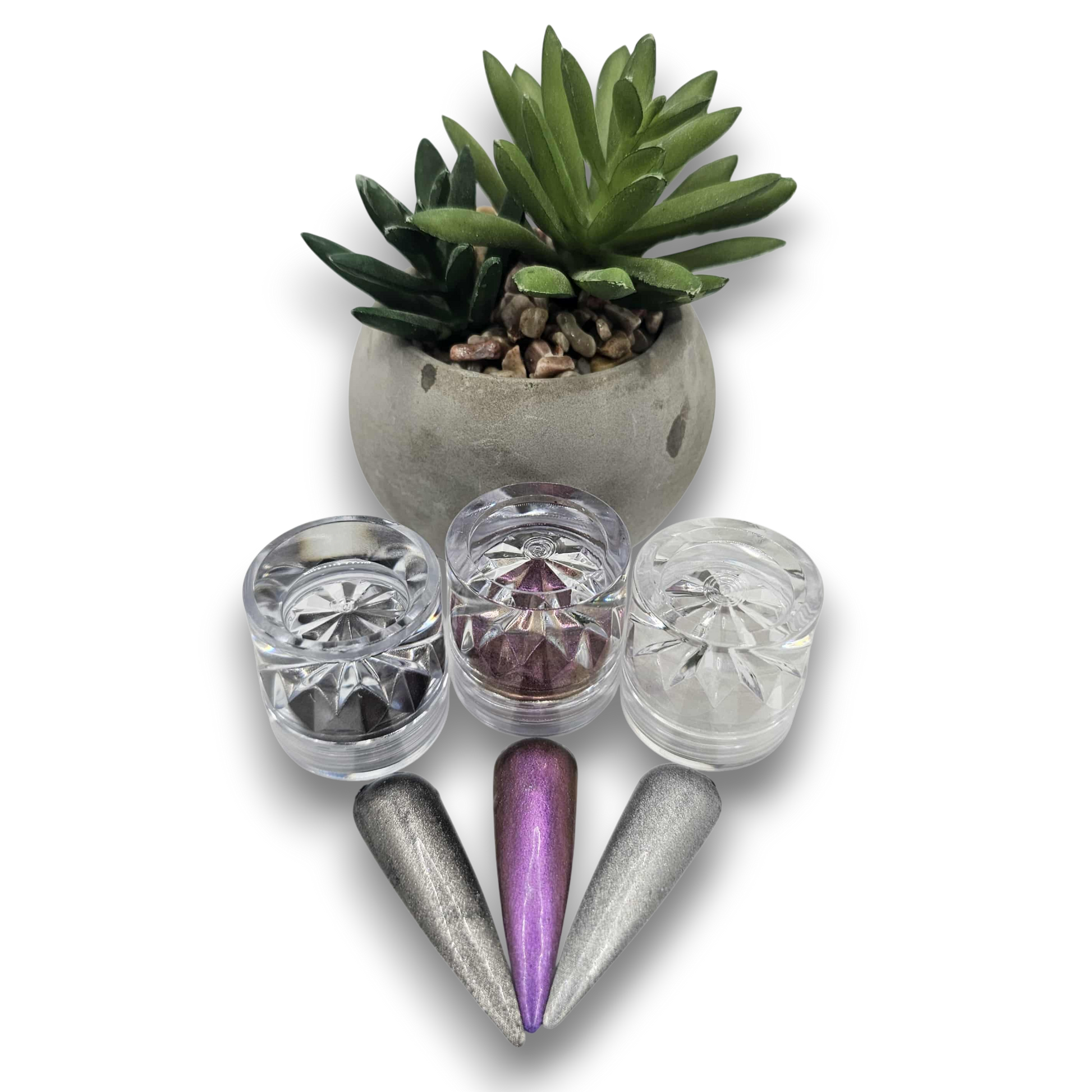 - Formulées avec des pigments chromés métalliques de luxe, ces poudres créent un effet miroir sophistiqué.